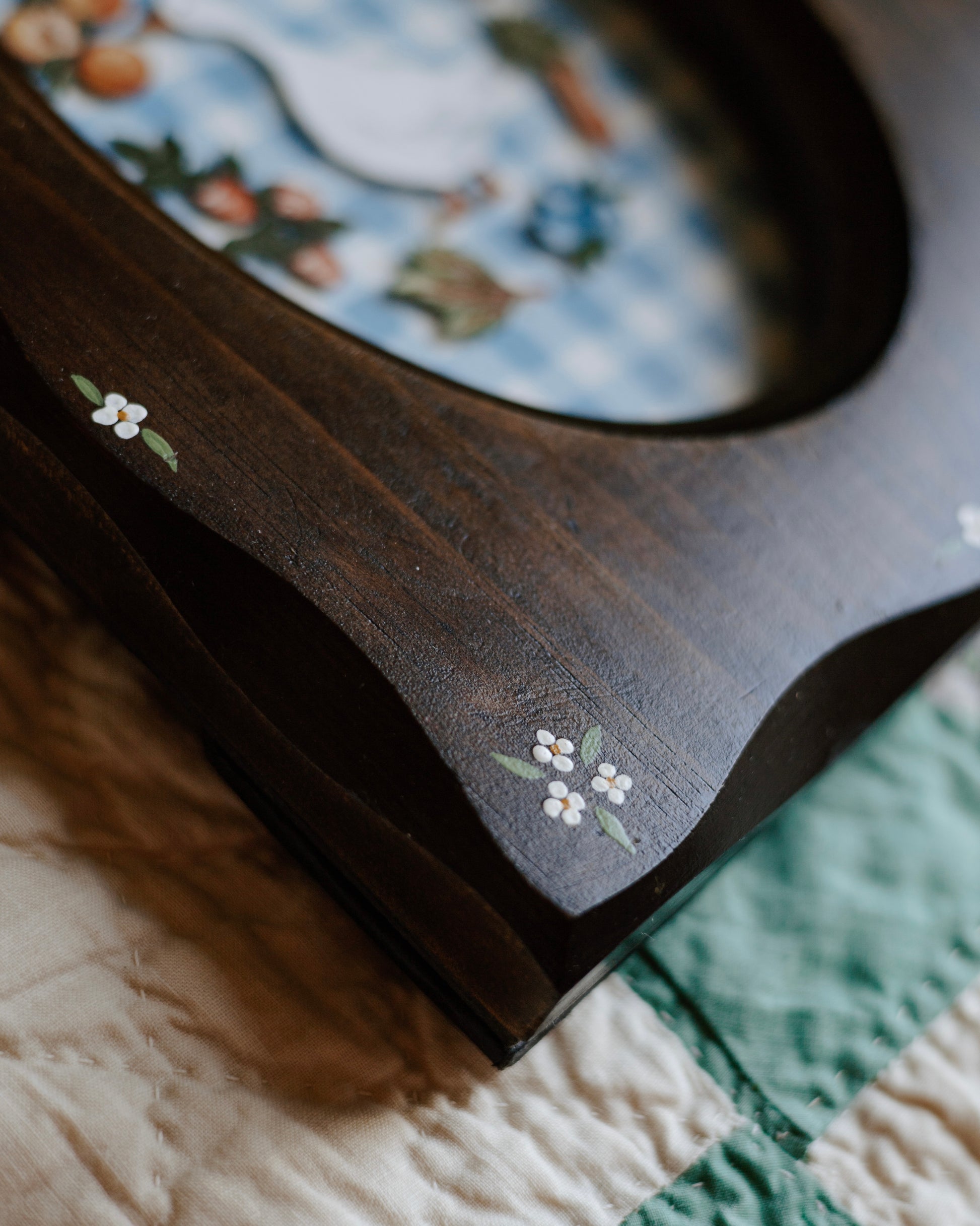 -Hand-painted flowers adorn the frame