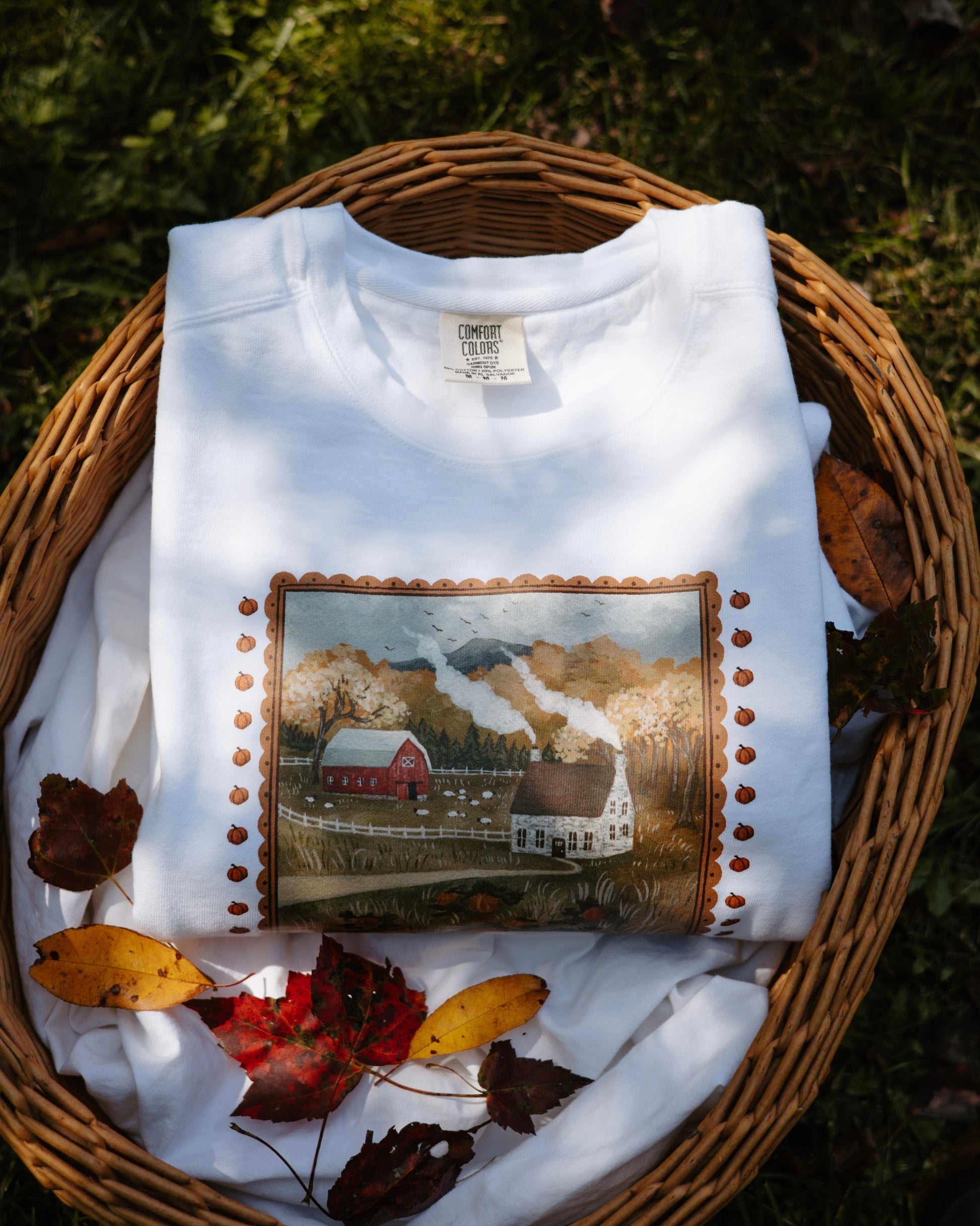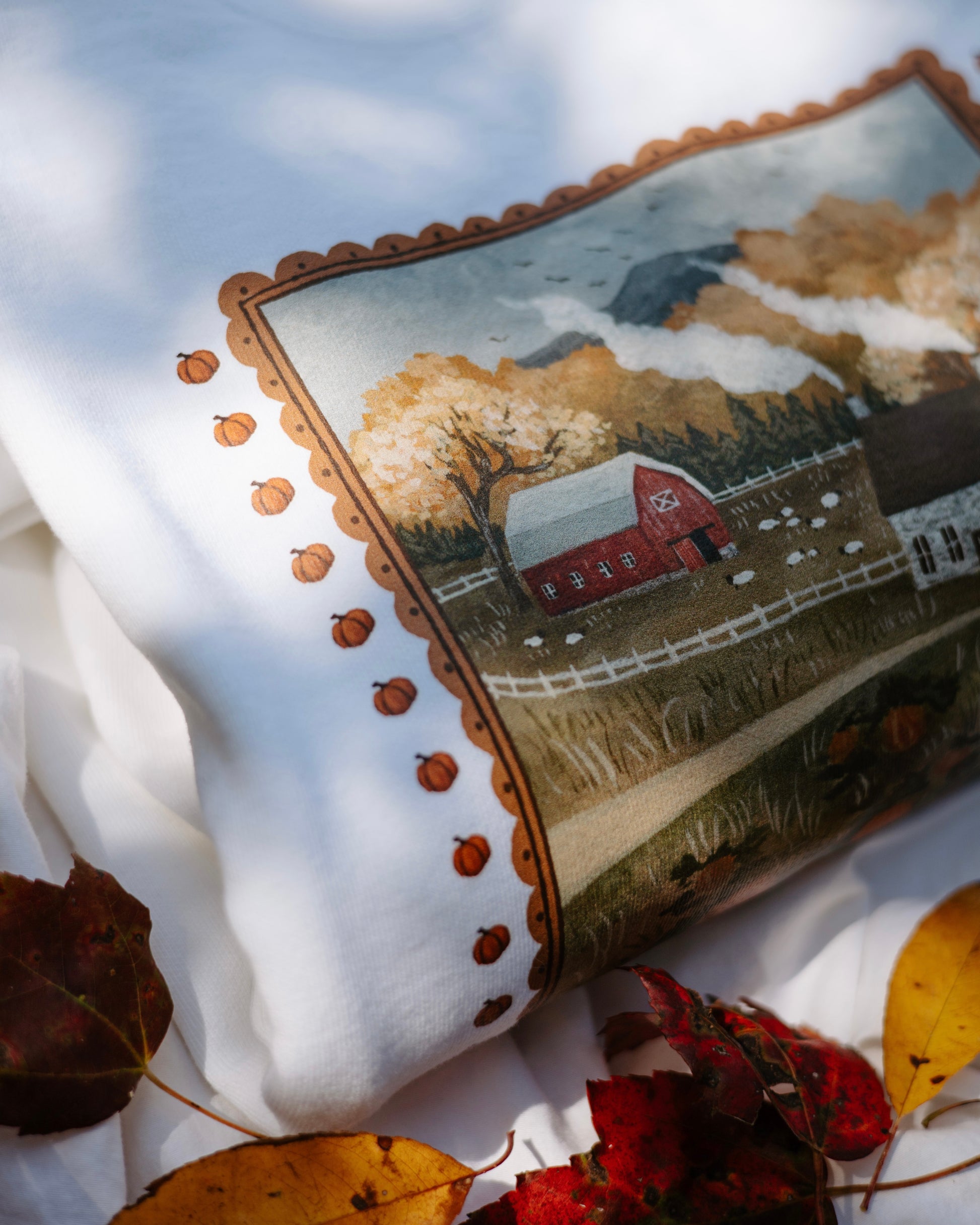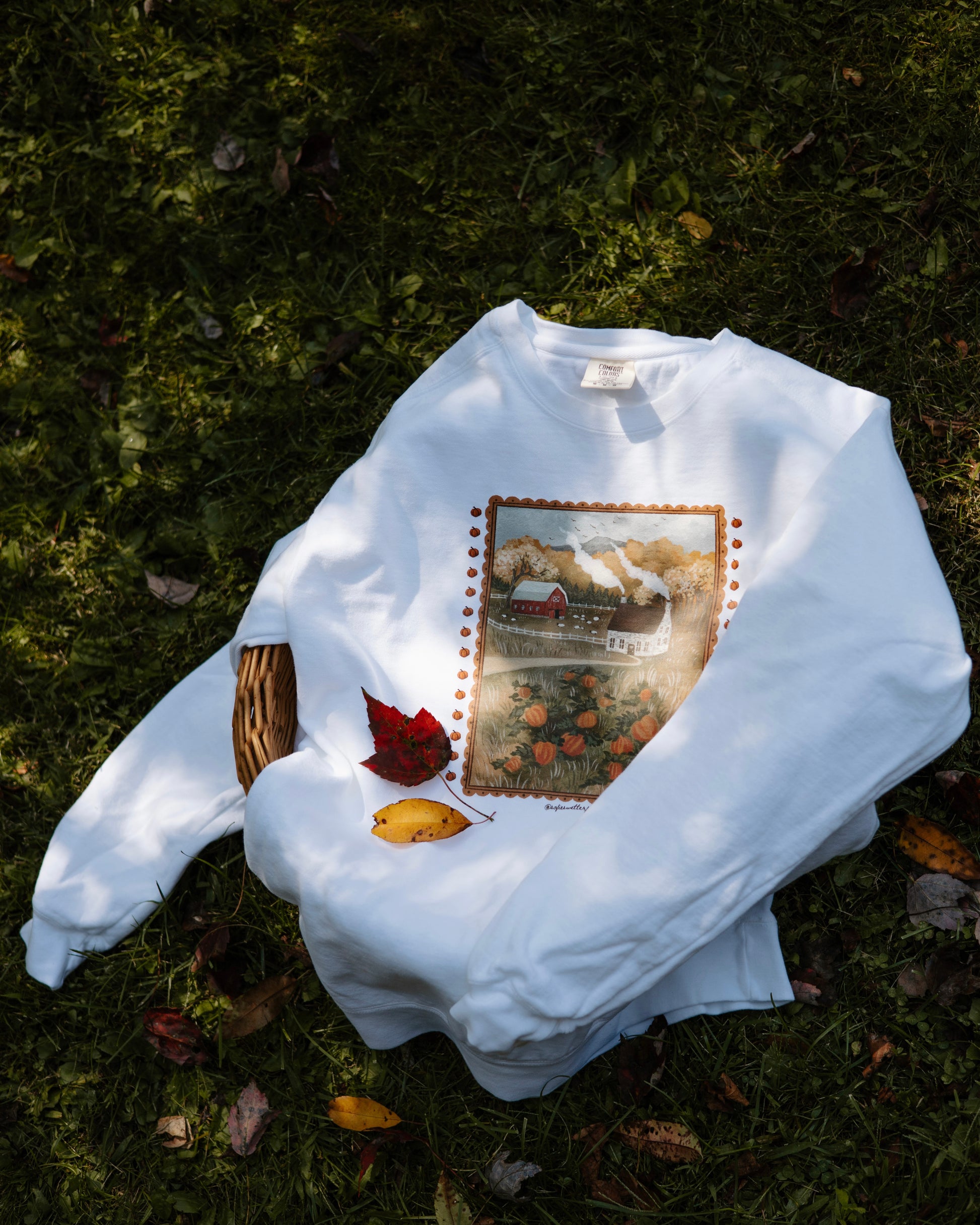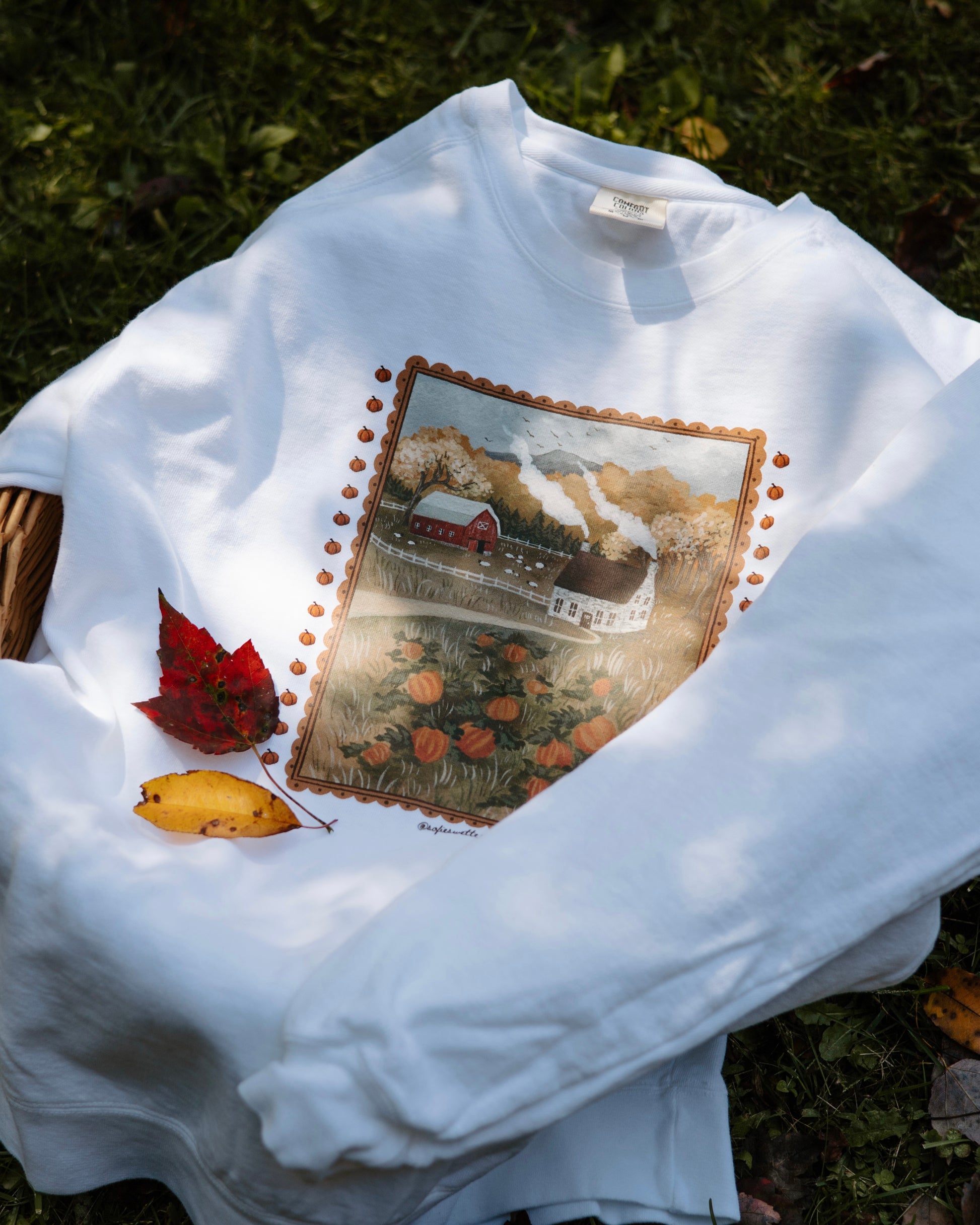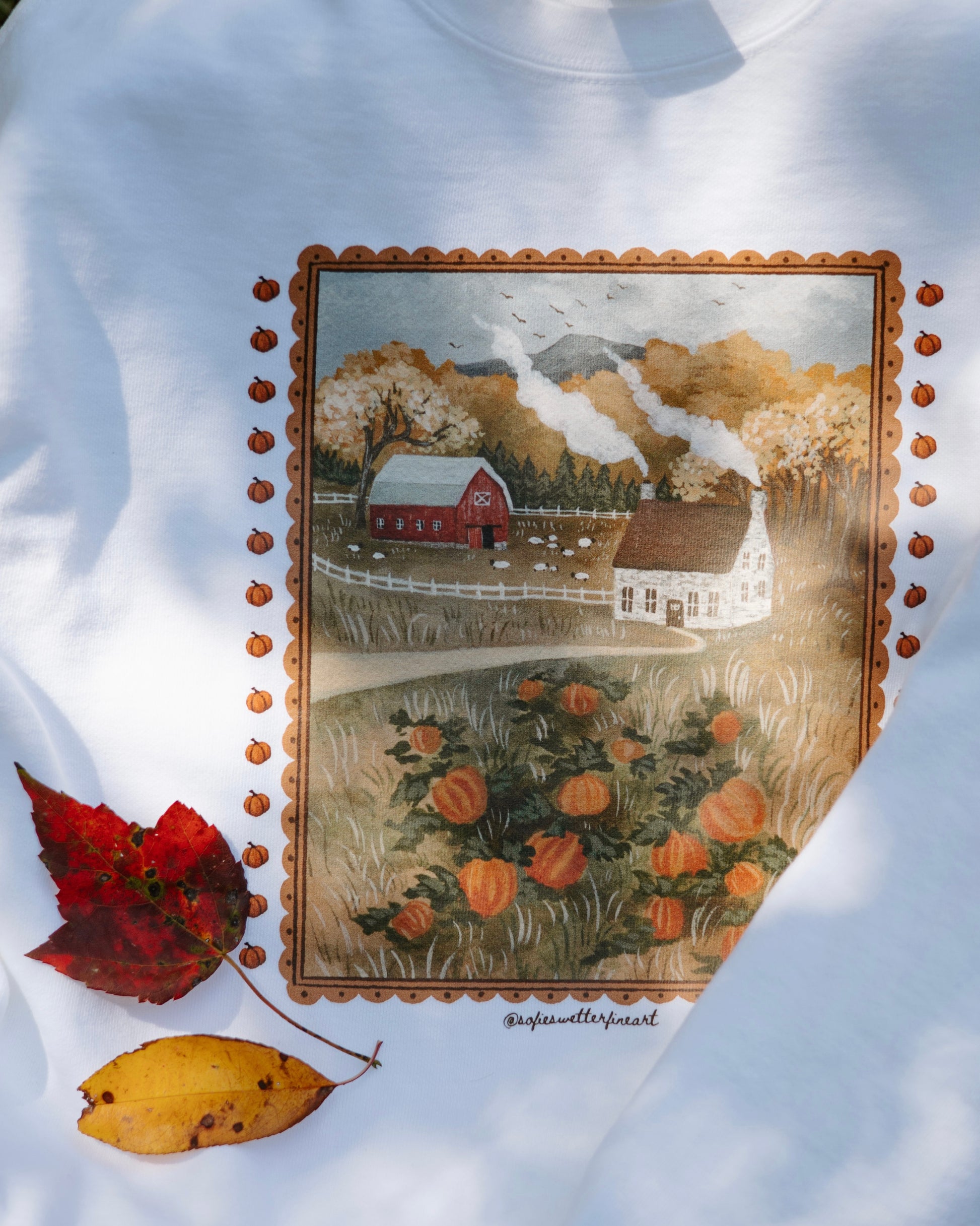 -Sweatshirt features the painting, “The Pumpkin Patch”