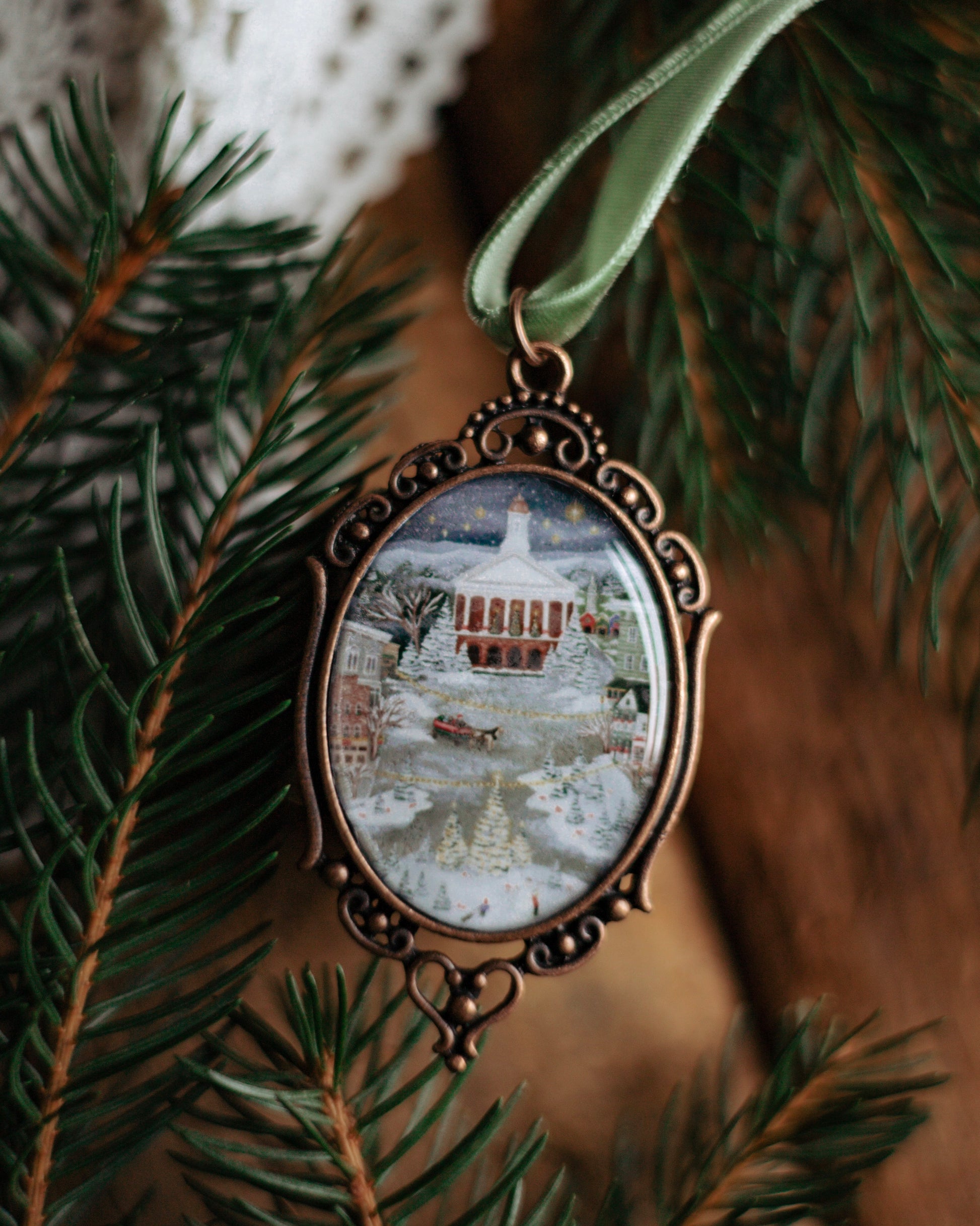 -Printed scene inside of a metal ornament base with velvet ribbon