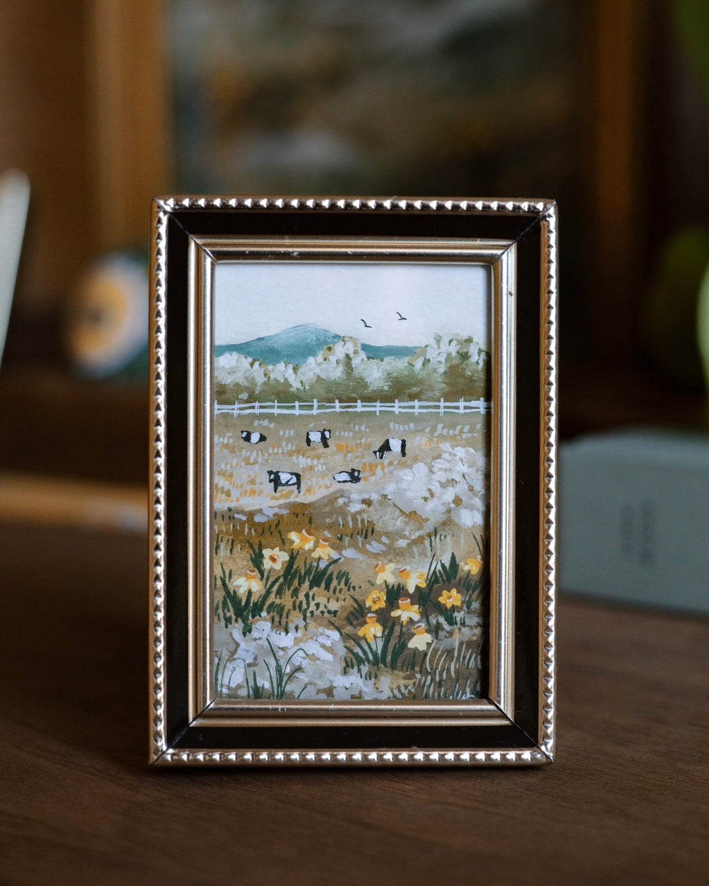 “Daffodil Pasture”- ORIGINAL Mini Painting in Vintage Frame