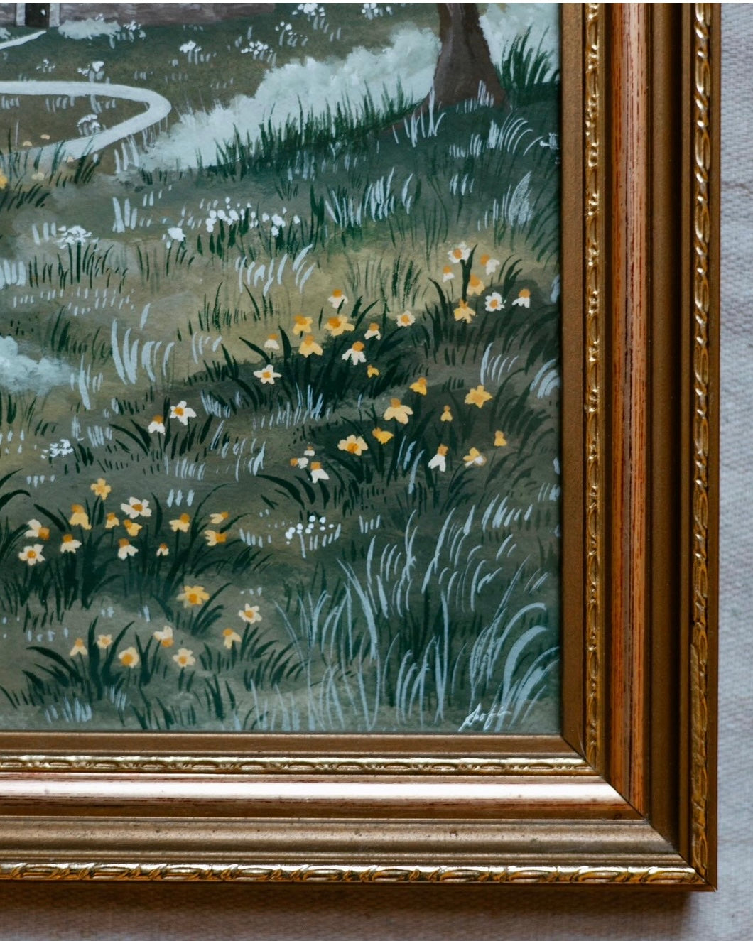 “Stone House in March”- ORIGINAL Gouache Painting in Vintage Frame