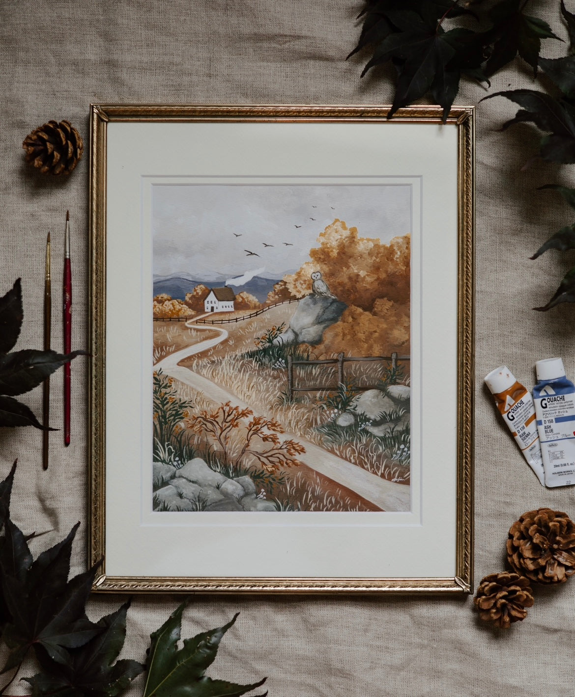 “The Autumn Owl”- ORIGINAL Gouache Painting in Vintage Frame
